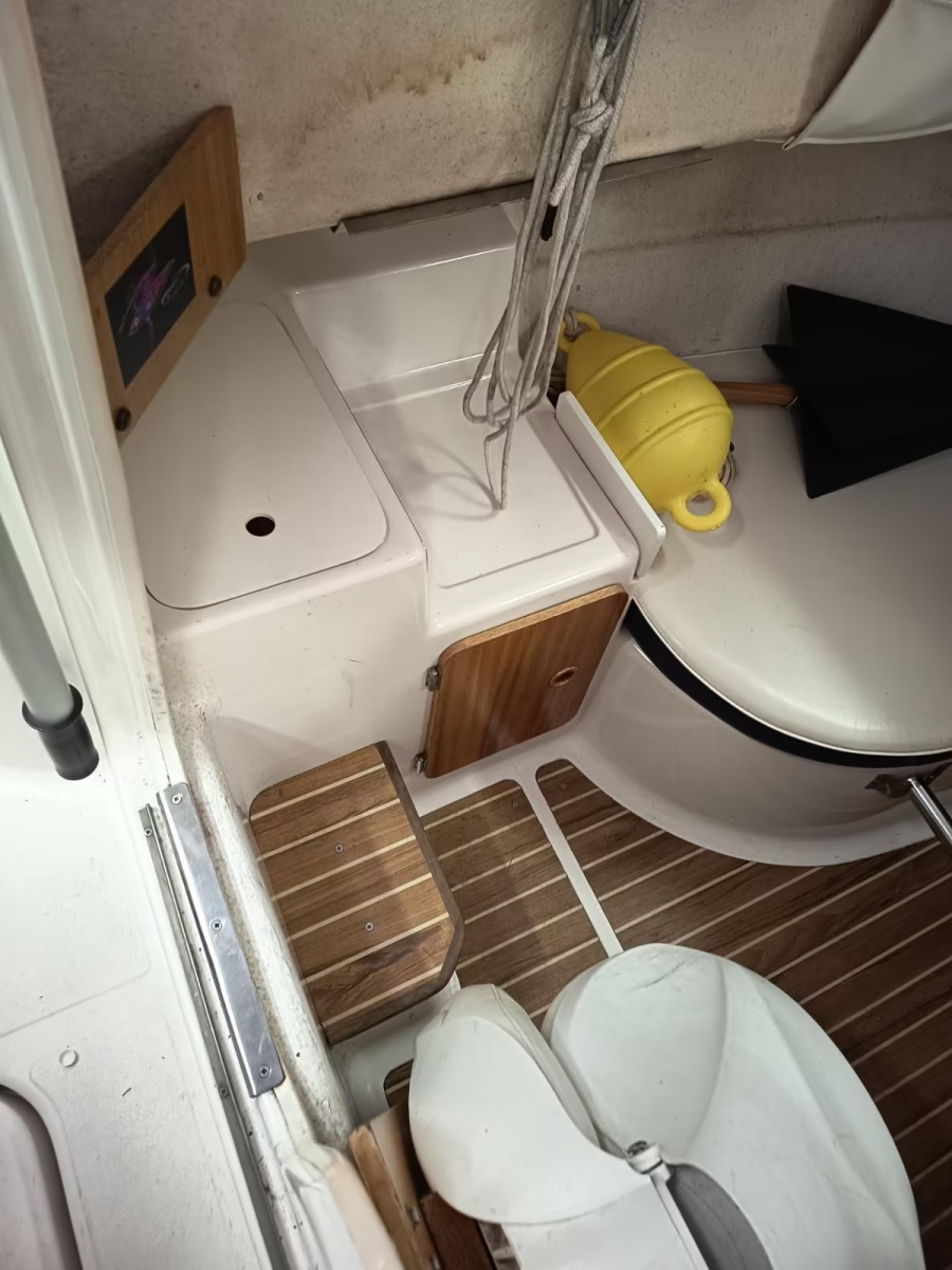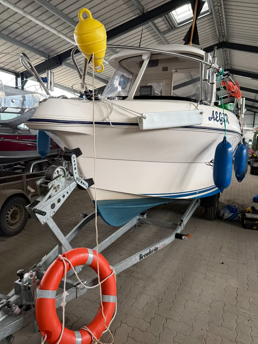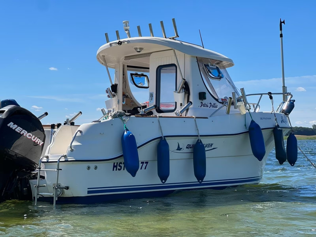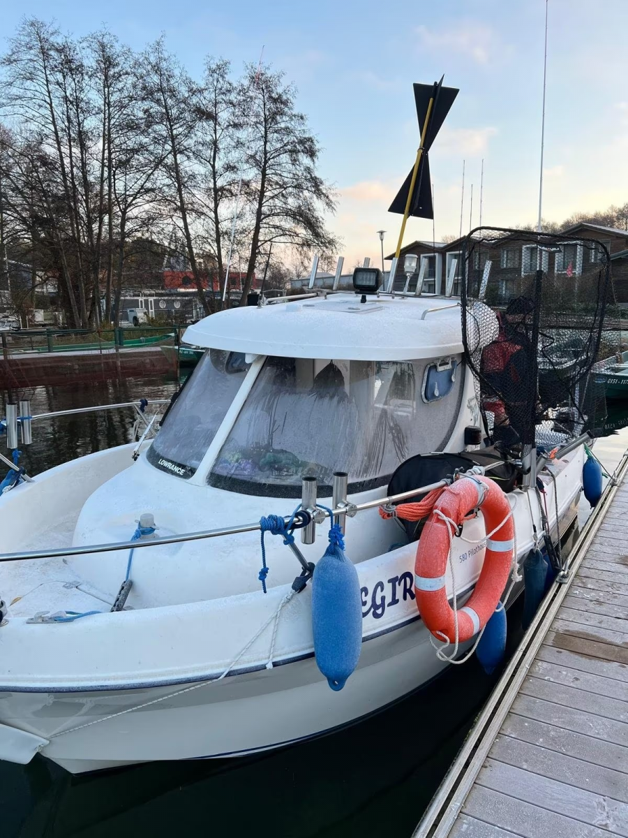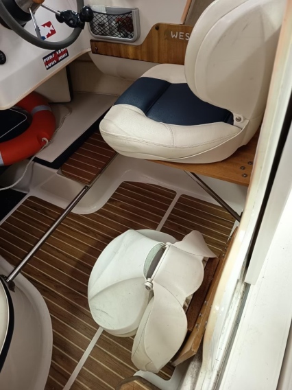 Zusatz: Deckstisch mit eigener Base - Deckstuhl Springfield Marine Fish Pro II Hihg Back Dark Gray auf festen Stuhlbein (41,8cm) mit Trac-Loc Swivel Drehteller (März 2024 neu) eigene Base und weiterer Sitz an Deck - 2 Sitzplätze (org. Quicksilver) & Liegefläche im Innenbereich - separater Innenspiegel (Osculati Wasserski-Rückspiegel 10x30cm) für bessere Sicht nach hinten beim Fahren - Gaskocher, unbenutzte Chemietoilette, Feuerlöscher, 2 neuwertige Feststoffwesten, Becherhalter im Innenraum - Badeleiter - Signalkegel für Schleppangeln - 14 Edelstahlrutenhalter (INOX) und 2 Scotty Grundplatten 1010 (auf der wir 2 Rutenständer auf separater Platte montiert haben und somit entfernt werden können, um Downrigger zu montieren) - Rutenständerbügel für 7 Ruten auf dem Dach - Rutenständer im Heck (Motorwanne) für 4 Ruten - Hilfsmotorhalterung - Rettungsring mit Leine und Halterung an der Reeling verbaut - 2 Fenderkörbe an der Reeling verbaut - 10 Fender und ein Bugfender - mit "Fastfender" für Schnellmontage Reeling - Bootshaken - Verdunkelungsrollo unterm Dachfenster - Ablagebecher (Wasser kann ablaufen) für Köder - 3 abschließbare, trockene Staufächer im Decksboden - abschließbares Batteriefach - abschließbare Kabinentür