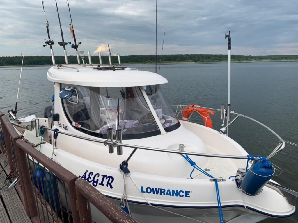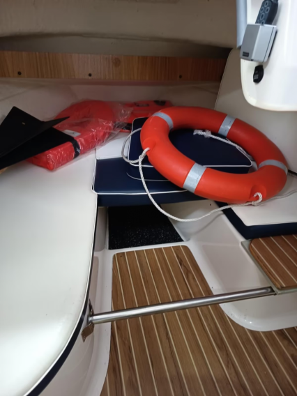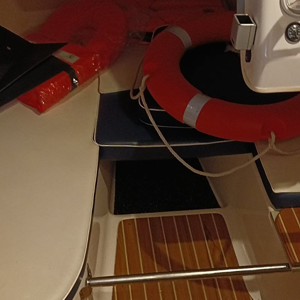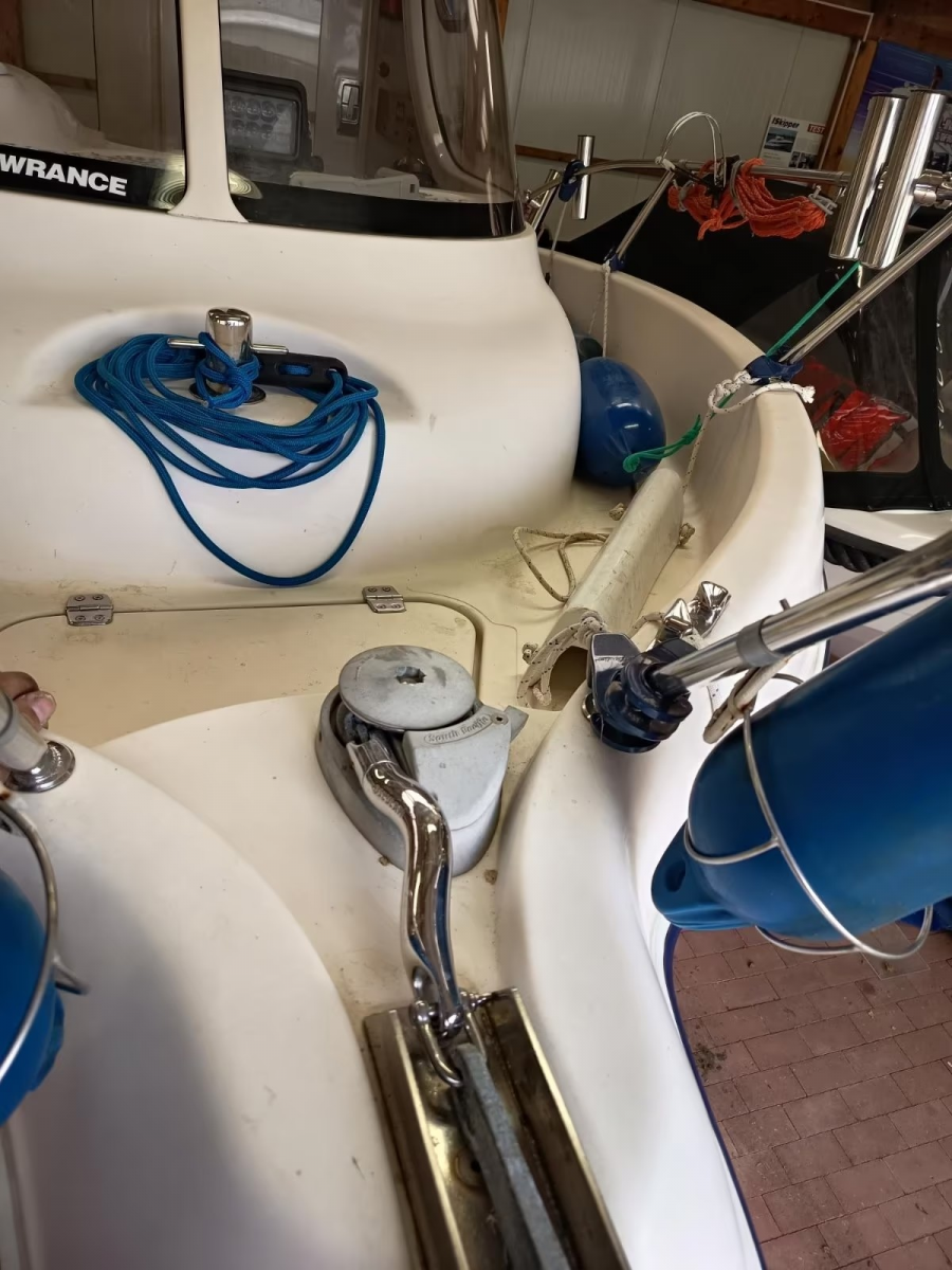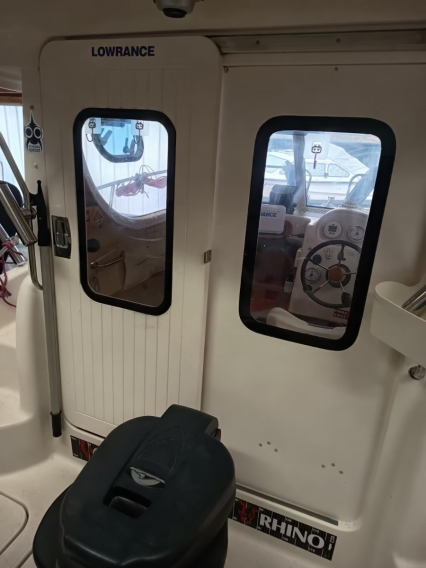 Zusatz: Deckstisch mit eigener Base - Deckstuhl Springfield Marine Fish Pro II Hihg Back Dark Gray auf festen Stuhlbein (41,8cm) mit Trac-Loc Swivel Drehteller (März 2024 neu) eigene Base und weiterer Sitz an Deck - 2 Sitzplätze (org. Quicksilver) & Liegefläche im Innenbereich - separater Innenspiegel (Osculati Wasserski-Rückspiegel 10x30cm) für bessere Sicht nach hinten beim Fahren - Gaskocher, unbenutzte Chemietoilette, Feuerlöscher, 2 neuwertige Feststoffwesten, Becherhalter im Innenraum - Badeleiter - Signalkegel für Schleppangeln - 14 Edelstahlrutenhalter (INOX) und 2 Scotty Grundplatten 1010 (auf der wir 2 Rutenständer auf separater Platte montiert haben und somit entfernt werden können, um Downrigger zu montieren) - Rutenständerbügel für 7 Ruten auf dem Dach - Rutenständer im Heck (Motorwanne) für 4 Ruten - Hilfsmotorhalterung - Rettungsring mit Leine und Halterung an der Reeling verbaut - 2 Fenderkörbe an der Reeling verbaut - 10 Fender und ein Bugfender - mit "Fastfender" für Schnellmontage Reeling - Bootshaken - Verdunkelungsrollo unterm Dachfenster - Ablagebecher (Wasser kann ablaufen) für Köder - 3 abschließbare, trockene Staufächer im Decksboden - abschließbares Batteriefach - abschließbare Kabinentür