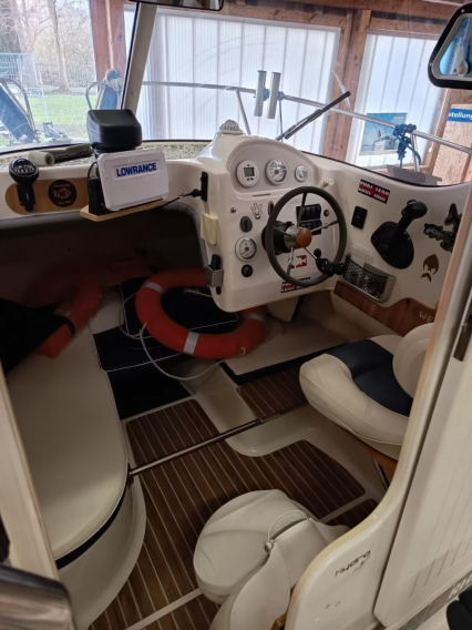 Techn. Ausstattung: Drehzahl- & Geschwindigkeitsmesser, Kraftstoffanzeige, org. Bootskompass, Trollcontrollsteuerung - Mercury Smartcraftanzeige - Hydrauliklenkung (Schläuche & Pumpe 12/2024 neu) - Echolot Lowrance HDS-9 Live mit Active Imaging 3-in-1-Heckgeber incl. C-Map MAX-N+ Local Germany Inland (05/2020) & Lowrance Autopilot - BSH Beleuchtung, (Toplicht, Kabinen- und Decksbeleuchtung LED) - elektr. Ankerwinde mit 10kg Anker und Kette (25m) am Twist Ankerwirbel, Ankerball & Seil zur Entlastung Ankerwinde - Deckswaschanlage & Livewell - Bilgepumpen automatisch & manuell ansteuerbar - Scheibenwischer - Radio - portabler LED Suchscheinwerfer mit Fernsteuerung (Magnetfuß mit Befestigungsplatte auf dem Dach) - Doppelsteckdose (12 V & 2x USB) und 1x 12V Steckdose - Maglite Stabtaschenlampe in Halterung links von der Tür - Peilkompass in Halterung links vom Echolot