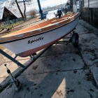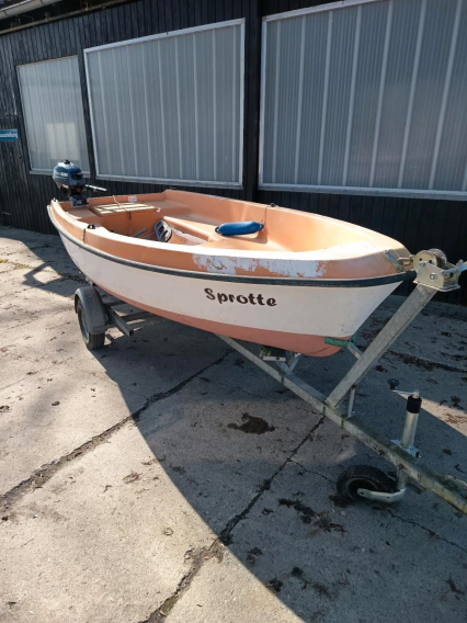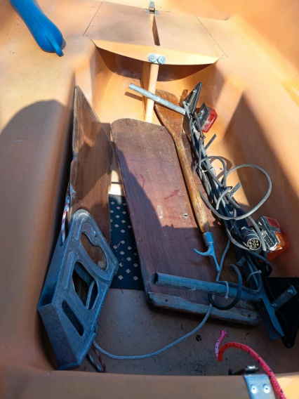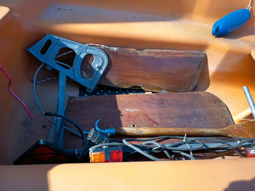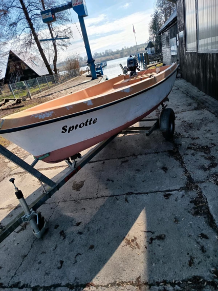 Zum Boot gibt es keinen Mast und kein Segel. Der Mast war ursprünglich aus Aluminium und die Segelfläche 9 m² groß. Vorhanden sind aber Einsteckschwert und Ruderpinne. Das Boot liegt sehr kippstabil im Wasser und eignet sich hervorragend zum Angeln. Es ist dicht und hat keine offenen Stellen am Rumpf. Lediglich die Farbe sieht nicht mehr gut aus.